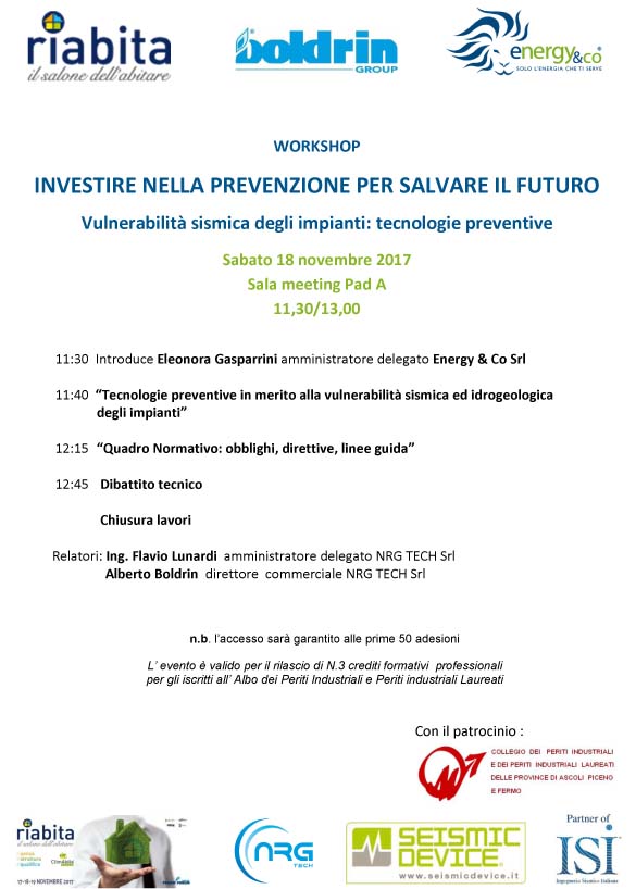 Energy&Co vi aspetta al padiglione B stand D8, e vi invita a partecipare sabato 18 novembre alle ore 11:30, presso la sala meeting padiglione A, al workshop “Investire nella prevenzione per salvare il futuro – vulnerabilità sismica degli impianti: tecnologie preventive”.