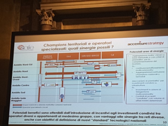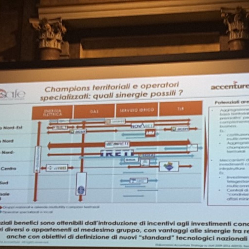Pur futuristico, il tema dell’integrazione tra le reti – ha concluso Danilo Troncarelli, Managing Director di Accenture Strategy – è entrato anche nella sfera di interesse dell’Unione europea, laddove, nel Programma Quadro europeo per la Ricerca e l’Innovazione Horizon 2020, sono messi a disposizione 28 milioni di euro per progetti indirizzati allo sviluppo di tecnologie e sistemi, che creino sinergie tra le reti di elettricità, gas e calore. Un’ ulteriore spinta ad esplorare le opportunità di efficientamento offerte dalla gestione sinergica delle reti energetiche e ambientali.